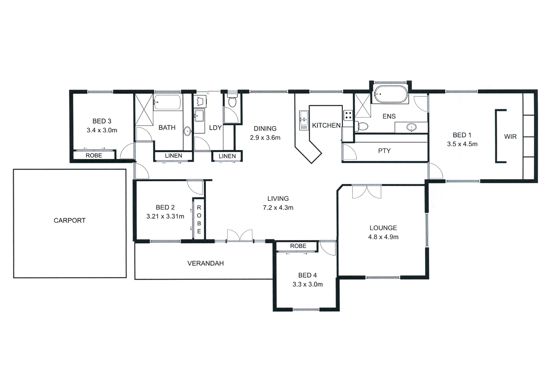 * Clever floor plan with separate hallways leading to main bedroom and family bedrooms.
